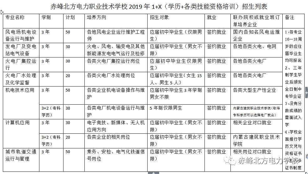 1、即日起接受参会预报名,请参会家长、学生7月17日前向学校驻地招生老师预定名额,额满为止。 2、学校接待时间:7月18日、19日早8:00时至下午17:00。 二、咨询会地点 赤峰北方电力职业技术学校东侧楼一楼接待室。 咨询电话:13904763424(微信同号) 三,本次咨询会集合了本校招生、管理、升学、就业、后勤等各部门负责老师,将会为各位莅临家长、学生对本校各方面工作做出最具体、最权威的解答。 四、7月20日起,来校咨询家长学生将由学校值班老师接待。 赤峰北方电力职业技术学校2019年招生介绍 学校概况:赤峰北方电力职业技术学校是经赤峰市教育局批准成立的中等职业学校。十几年来,在上级党委、政府的关怀下,在教育主管部门的大力支持下,我校始终坚持“为学生前程负责、为家长希冀负责、为企业用人负责、为社会发展负责” 的办学宗旨,利用专业优势、师资优势、管理优势、就业优势着力培养学生的就业、创业能力。 学校荣誉:多年来,学校不断发展壮大,成绩骄人。经过历代教育工作者的努力,学校现已成为具有完善的基础设施、雄厚的师资力量、先进的教学设备、优美的育人环境、多层次办学体系的现代化职业学校。近年来,我校不断发展壮大,连续评为《红山区民办教育先进单位》、《全国民办教育先进单位》等荣誉称号。 专业设置:学校专业设置分为两大类:一是技术类专业,开设专业有火电厂集控运行专业、发电厂及变电站电气设备专业、火电厂水处理及化学监督专业、风电场机电设备运行与维护专业、机电技术应用专业、计算机应用专业等。二是服务类专业,如城市轨道交通运营与管理专业、航空服务专业、行政会务专业等。历届毕业生遍布全国各地,许多人成为各领域领域的骨干、领导。为进一步解决大中院校就业问题、满足合作单位用人需求,我校同时开展短期培训项目。 就业优势:学校坚持“育人为本,德育为先”及“1+X”的教育理念(注:1+X即学历+各类实用技能资格证书),以“修德安身 学技立命”为校训,十分重视学生的德育养成长和基础发展,确定了“以活动为载体,让学生在活动中体验、在活动中成长、在活动中成才”的育人思路,搭建起由素质教育课、主题教育活动、社会实践活动和各类专业技能与文体竞赛组成的课外活动育人平台。同时,我校也承担着赤峰市劳动局、市安监局定点培训任务,学生在校期间即可考取各类资格证书。2018年学校投资二百余万元引进安装了各类实训设备(火电、风电模拟系统、电竞室、电工作业培训等)。为实现学生就业后的全面发展创造了积极条件。近三年学校平均就业率为100%近两年平均专业对口率为100%。随着学校社会影响力的不断提升,国内外知名企事业单位对我校毕业生质量给予高度认可,主动找上门来接收我校学生实习和就业。我校原有的实习就业主阵地不断稳固和扩大,一些有着长期合作关系的就业单位对我校学生的需求量也在不断增加。 升学优势:学生取得本校中专毕业证后,如想提升学历,可以参加本校合作专科院校(内蒙古建筑职业学院)获得入学资格和提升学历的需求。 资助政策:1、学生免书费。2、符合条件在校生享受国家助学金两年,每年2000元至2500元(如国家政策调整,按调整后政策执行)。 招生条件:年龄15至24周岁,具有初高中及以上文化程度的应往届毕业生、退伍军人,地区、户籍不限。要求遵纪守法,身体健康,无纹身、烟疤烫痕,无酗酒吸烟等不良行为。 报考方式:学校除开设了中专班、高职班外,还有短期就业培训班,学生可根据自己的实际情况选择不同层次的学习,在校期间可考取各类国家职业资格证书(1+X)。中专毕业后还可报读合作院校取得专科以上学历(单招)。 学校网址:www.bfeps.com 入学时,学生必须带身份证原件及复印件6份(正反面复印在同一页A4纸上)、必须带户口复印件6份(户口簿首页和本人页复印在同一页A4纸上)用于办理资助。我校是教委公示的招生学校,各专业均招收赤峰市及外埠的应届、往届的初中、高中毕业生、大中专速读就业生(面试合格入学)。 即日起,学生及家长可到我校报名,也可参加网上报名(我校2019年招生名额为150名,建议低分考生到学校报名较为稳妥) 已修改 0/20 下一篇: 赤峰电校关于中考招生咨询会的公告